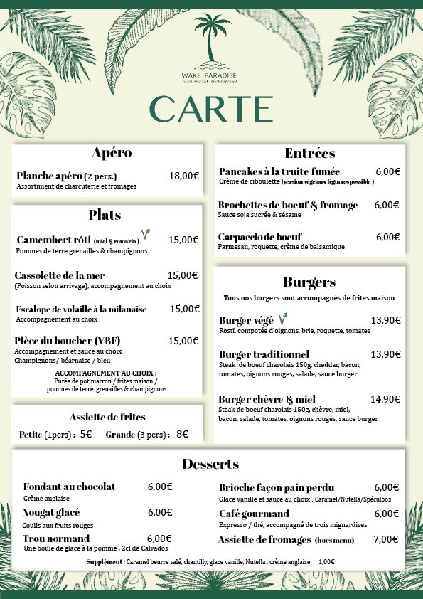 Le restaurant de Wake Paradise vous ouvre ses portes toute l’année dans un décors tropical et dépaysant. Julien et Guillaume vous proposent une carte pour chaque saison avec des produits frais et locaux.